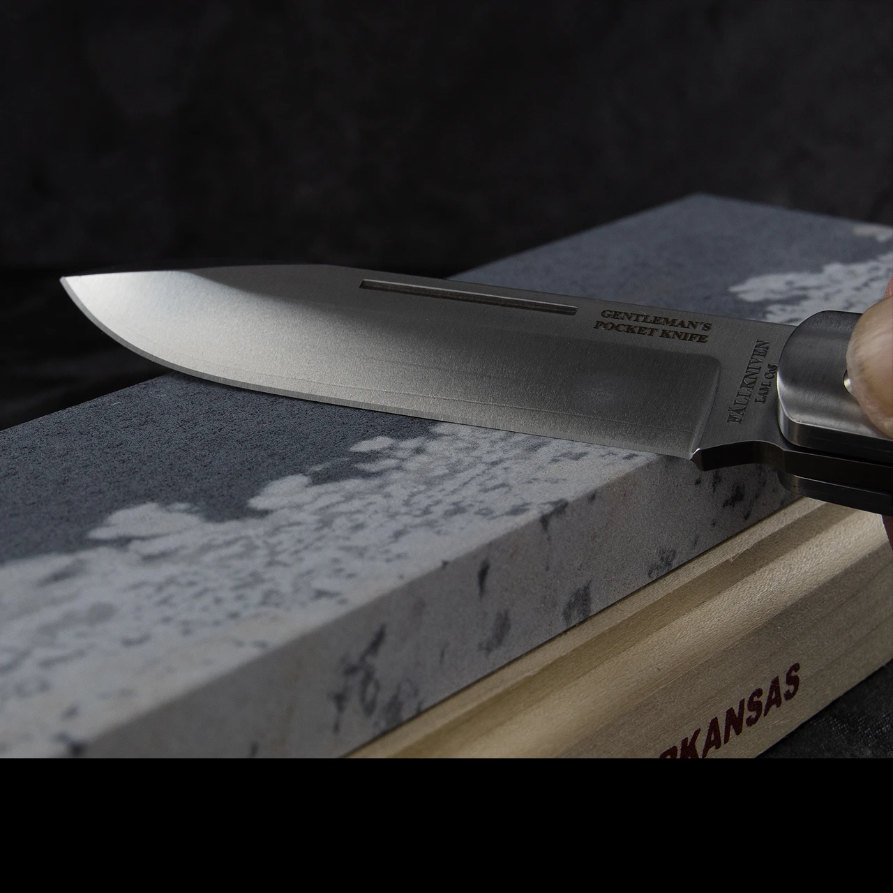 The Arkansas Whetstone Soft is mounted on a cedar wood block and works in the same way as a bench stone. It lies flat on a flat surface and can be sused with oil or water to give a fine degree of edge. Moisten the stone and gently move the knife blade in circular motions. Great for finishing off an edge and works very well on a Scandi grind. Â