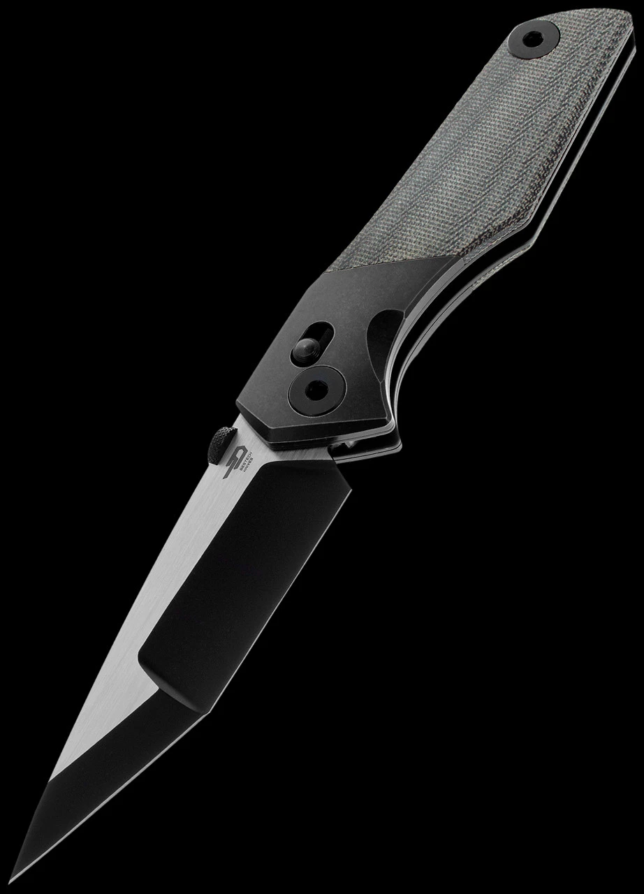 The blade is made from M390 stainless steel and is incredibly sharp out of the box with three grind plains forming a needle sharp point. The handle is made up of a bronzed Titanium bolster and micarta scales in a choice of natural or green with a blackwashed pocket clip attached. A slide lock provides the rock solid locking system.
