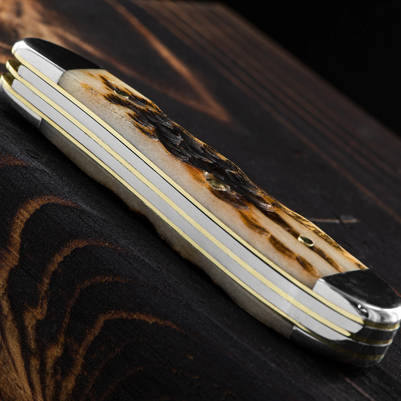 The rich amber hue of the unique handle style on these Case knives allows the natural beauty of jigged bone to take centre stage. Mirror Polished Tru-Sharp Surgical Steel Blades, Amber Jigged Bone Handles, Brass Pins and Liners, Nickel Silver Bolsters and Shield.