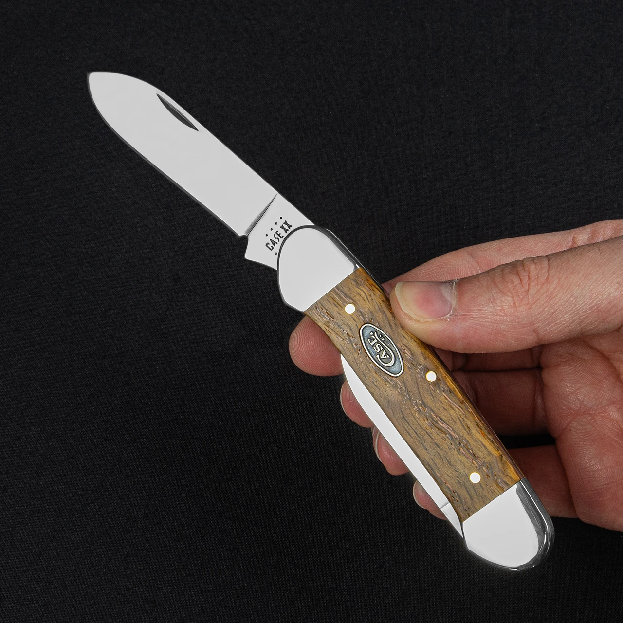 There are two blades, one large, one small both spear point and both incredibly sharp. They are both made from Case Tru-Sharp Stainless Steel. The handle scales are Yellow Curly Oak which is a time tested and very appealing material.