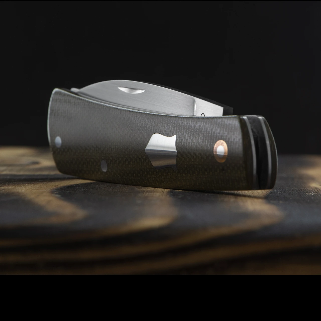 The handle is olive micarta with a “shield” stainless inlay and a copper lined pivot.