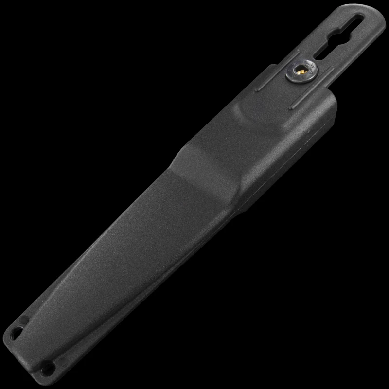 This sheath is not designed for belt carry. Instead it works very well with the knife in a leg pocket, not so common in the Nordic countries, but very common in central European countries. This sheath has no additional retention – the knife can be pulled out of the sheath without pressing any buttons – the knife sits deep and secure through friction in the tight polymer sheath.