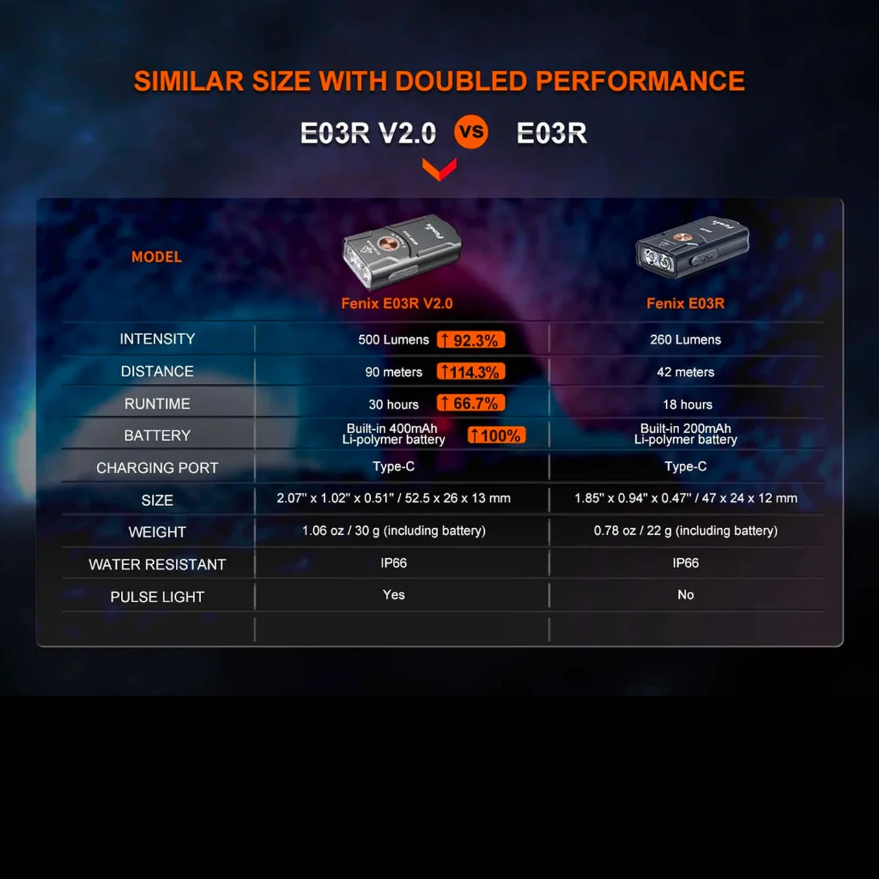 Compact and lightweight, the updated version of the E03R is ideal for everyday carry. The V2 offers brighter outputs, longer runtimes and an improved beam distance.
