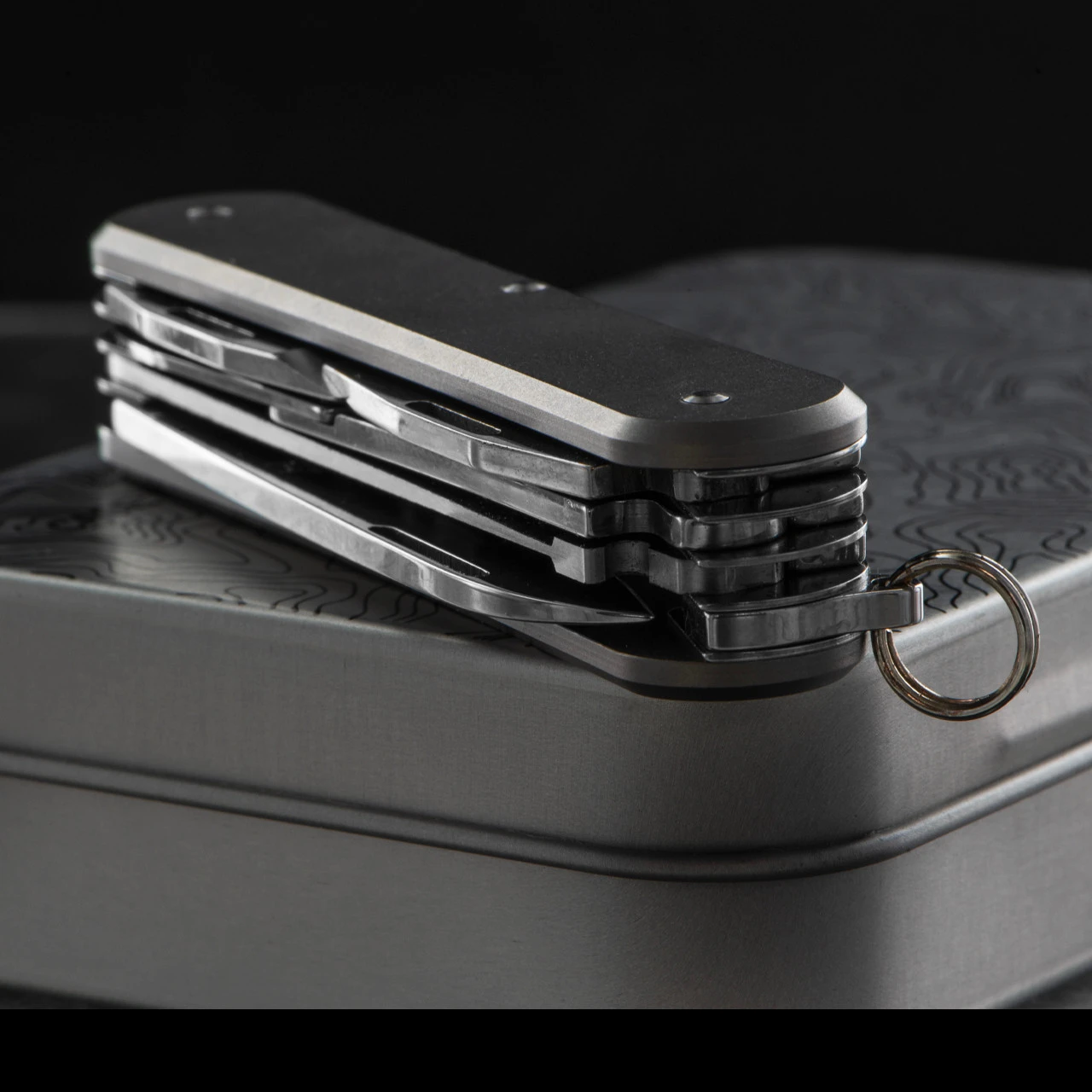 This version uses a lightweight and seriously strong Titanium handle and has four tools in addition to the stout little sheepsfoot blade. There’s a pair of scissors, a saw, a can opener with screwdriver and a bottle opener with screwdriver. Pop one on your keys with the keyring attached and go about your day!