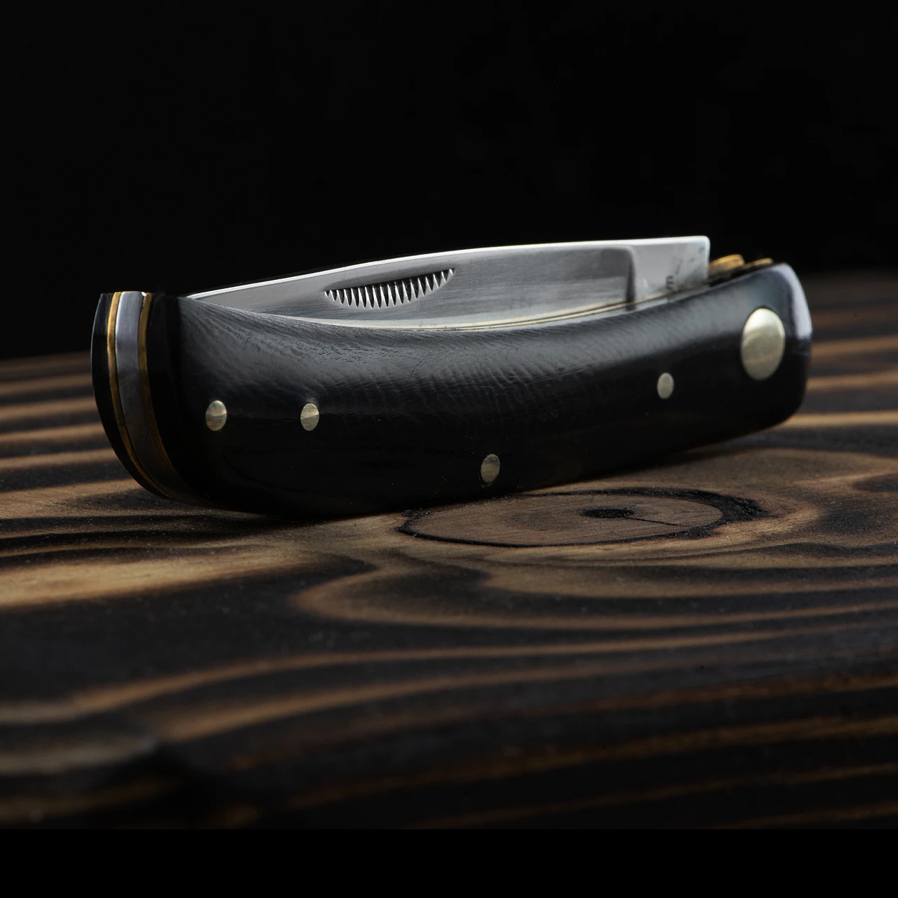 The Buffalo Hen and Rooster folder is an attractive little traditional slip joint penknife that is legal to carry in the UK. The blade is mirror polished 1.4116 Stainless Steel and snaps into the open and closed position securely. The handle is Buffalo horn with brass liners and nickel silver pins.Â
