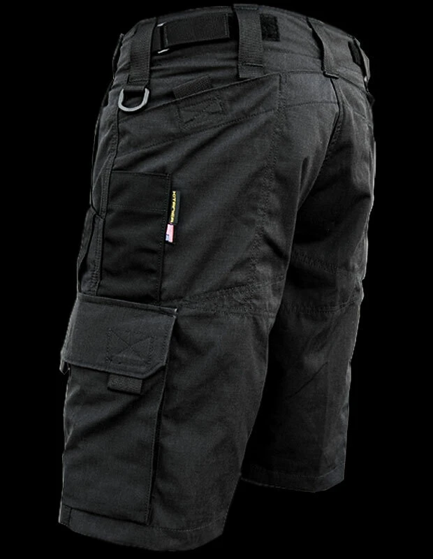 They are constructed of nylon/cotton Ripstop, have 2 hip pockets, 2 rear pockets, 2 side pockets, and 2 cargo pockets. They have CORDURA pocket corner reinforcement to prevent knife clip wear. The fit of the Range Shorts have a relaxed fit for hot weather, VELCRO cinching waistband and seven belt loops.
