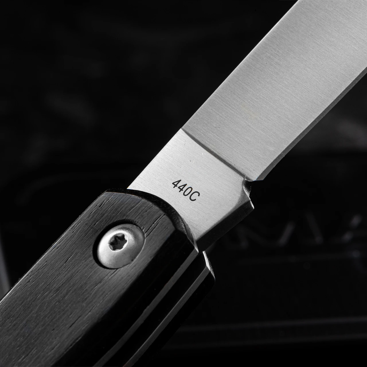 The satin-finished drop point blade is made of 440B stainless steel, opens with both hands with a nail nick and does not lock. The sturdy construction has ergonomically shaped handle scales made of dark ebony, which is extremely durable due to its high density.Â