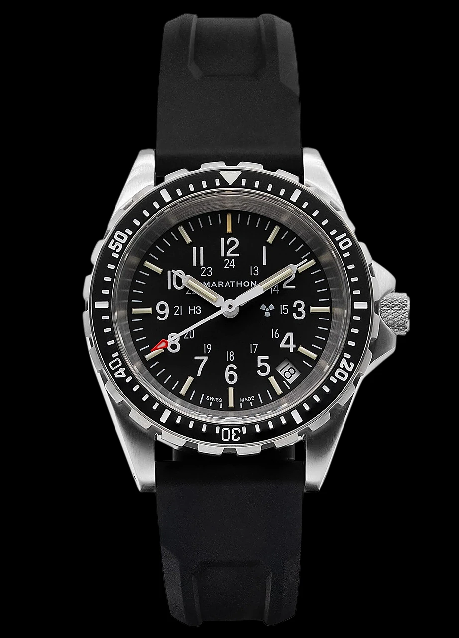 The Marathon Search & Rescue Diver’s Quartz Medium is a dive watch built to ISO 6425 standards. It is a smaller sized version of Marathon’s diver’s watches making it perfect for someone who wants a tough, reliable, and military issue dive watch that is smaller yet just as powerful as its larger brothers.