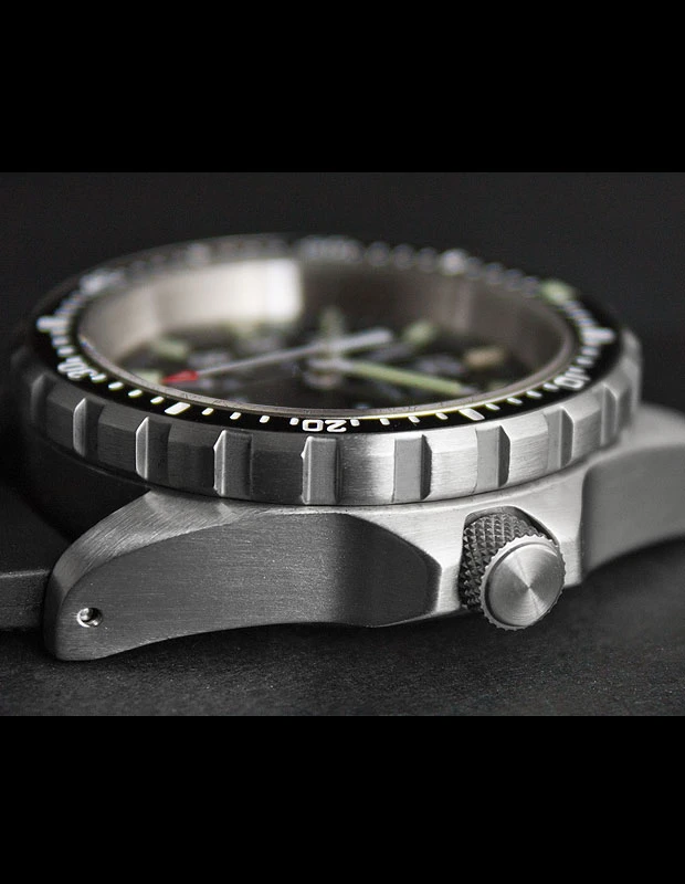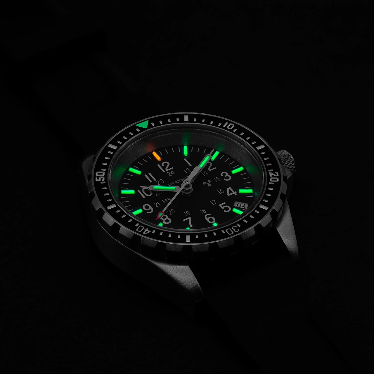 The Diver’s Quartz Medium uses self contained Tritium gas tubes to ensure constant visibility in low light situations, a Tritium gas tube is placed on each hour marker as well as the hour and minute hands. Tritium tubes are self illuminating gas tubes which contain an isotope of hydrogen that does not dull in brightness.