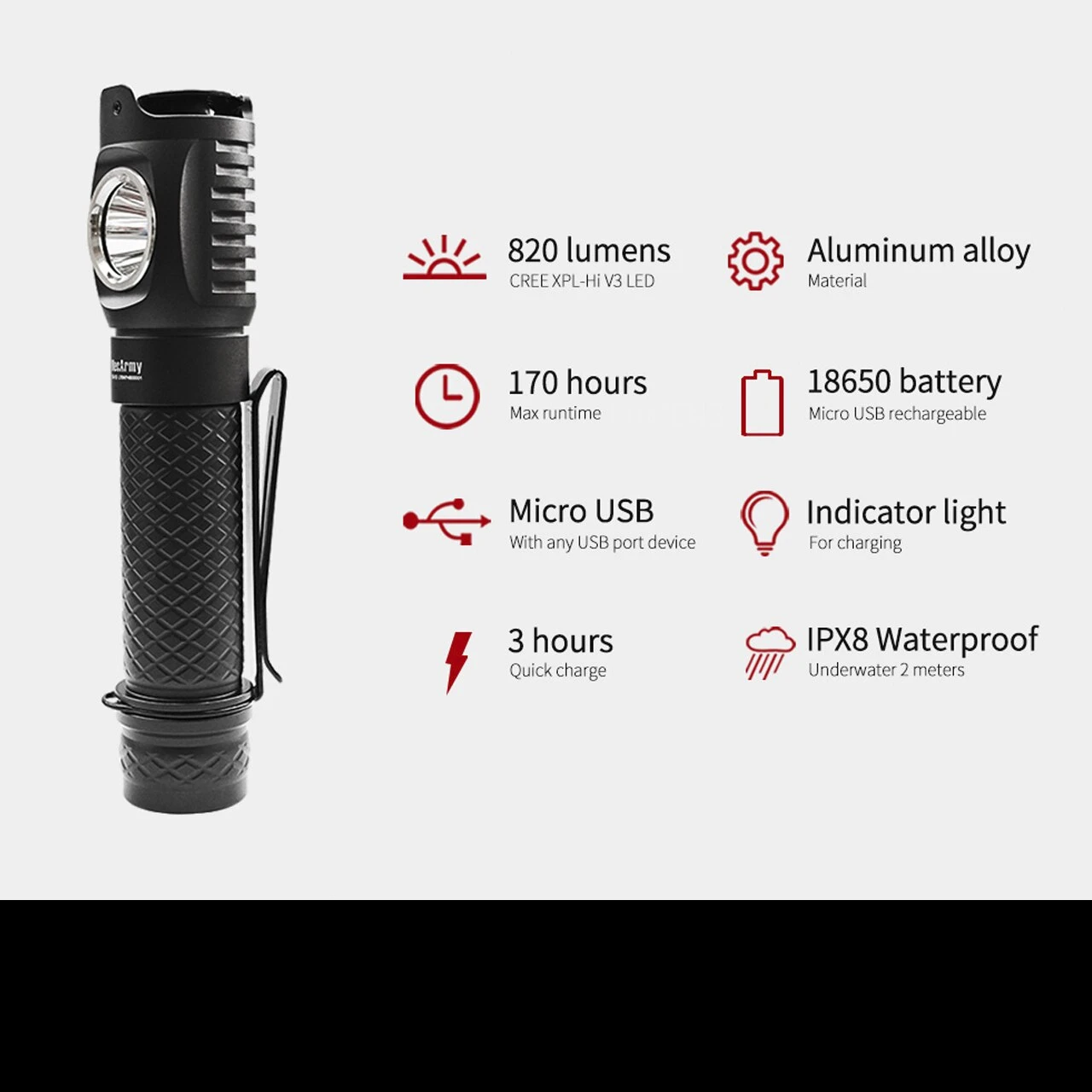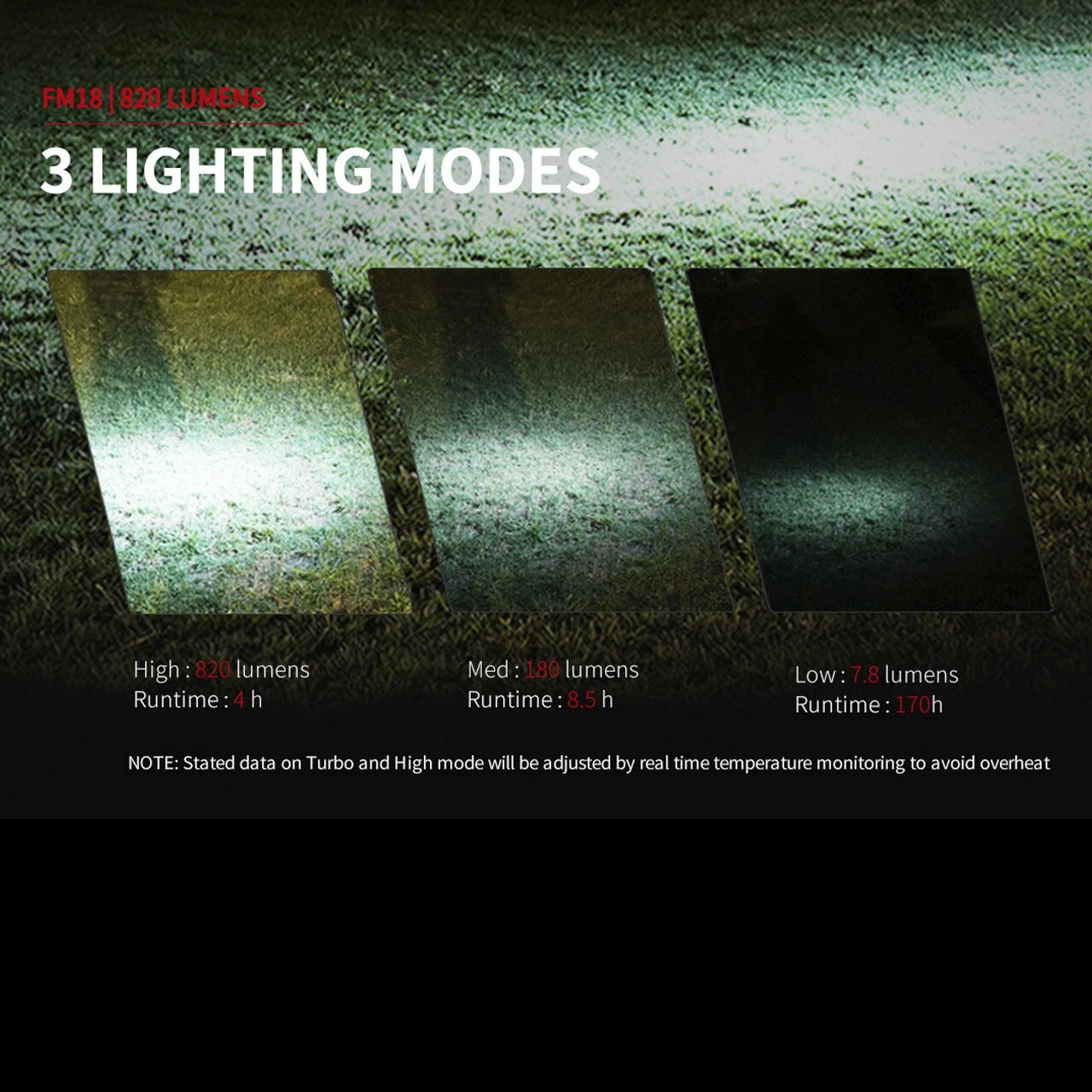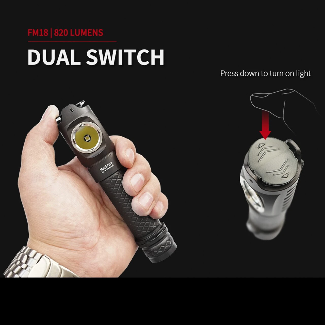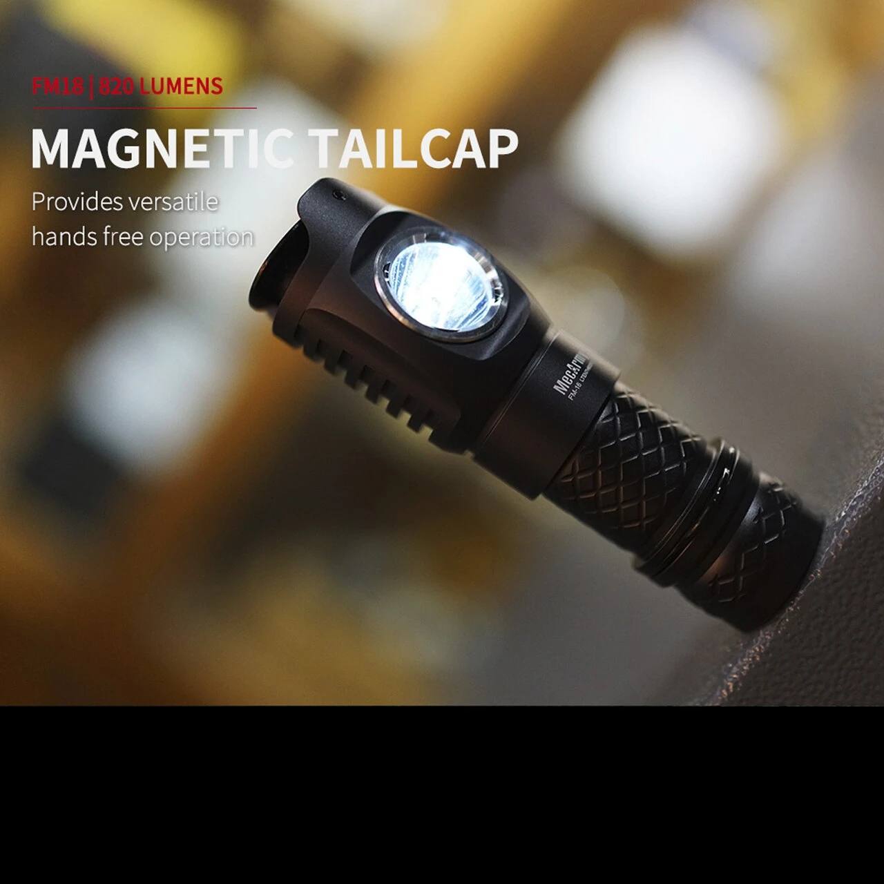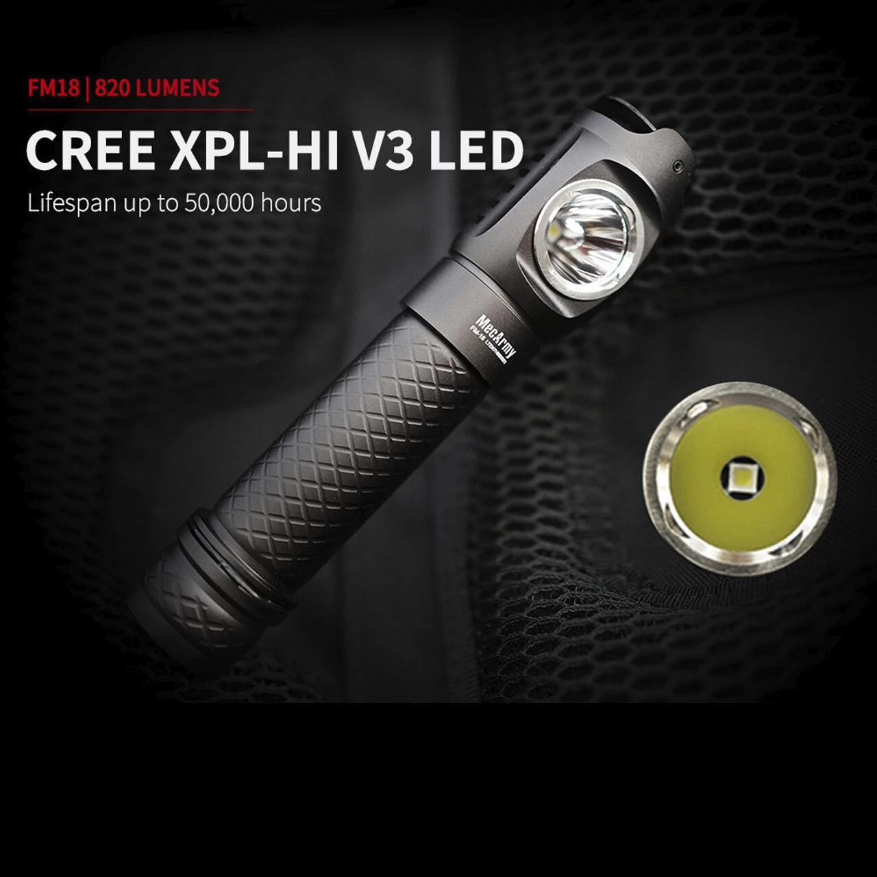The Mecarmy FM series lights are equipped with CREE XPL-HI LEDs delivering high lumen levels and constructed from aero grade HAIII aluminium alloy. The MecArmy FM18 blasts out 820 lumens in a standing out the front design. It features a pocket clip and magnetic tail cap making carry and work easier and more convenient. Charging is easy on the go, thanks to the built-in standard Micro USB charging port with only a cable on any USB power devices. FM18 is powered by 18650 Li-ion battery.