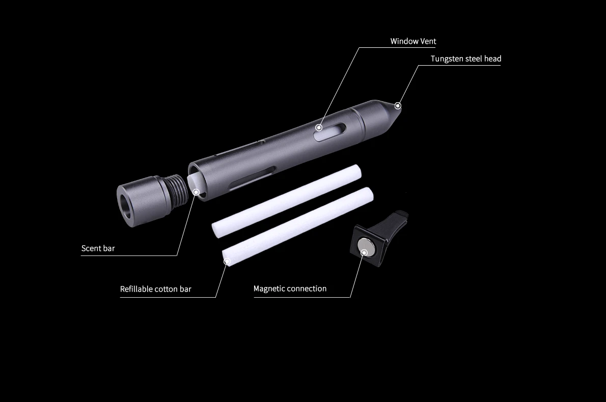 In essence it is a rod of skeletonised aluminium with a tungsten steel head emergency glass breaker. It is also supplied with a magnetic clip allowing you to store it it anywhere you wish within your car.