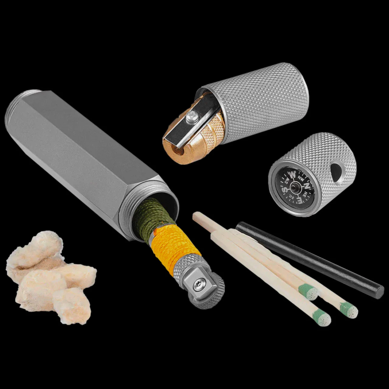 The Prometheus Ti-FST is a precision made titanium billet stash tube designed to store fire making supplies to create a small, yet fully self contained, survival fire making kit. The primary compartment is sized to fit the standard strike-anywhere match and/or the Prometheus Ti-1HSU Spark tool. The secondary compartment is sized to perfectly fit the German, barrel style pencil sharpener. This sharpener can create tinder shavings from suitably sized wood sticks, easily found in the wild. Or use this compartment to store pre-made tinder.Â