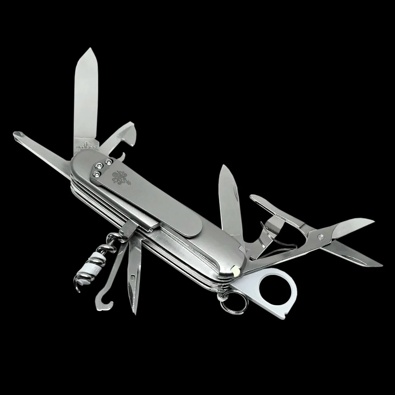 These quality T-SAK scales also have the factory pen slot, toothpick slot, tweezer slot, and the stick pin slot. The matched billet titanium pocket clip uses the standard 3 screw pattern so the user can swap out the clip and personalize with other after market pocket clips.