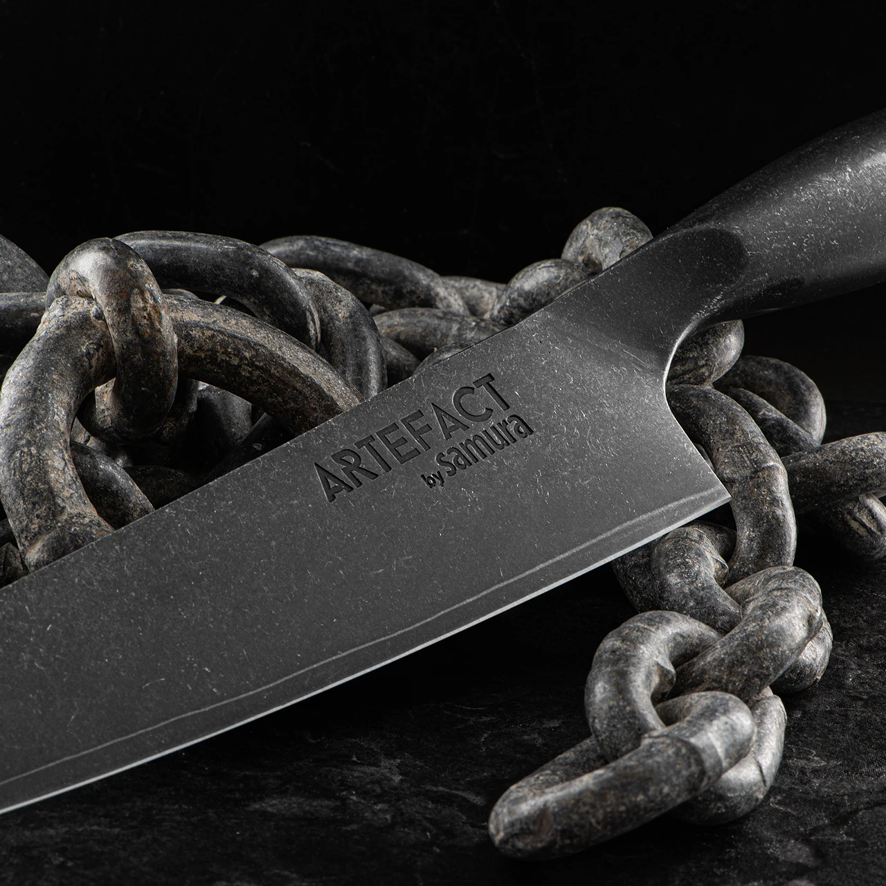 The Samura Artefact Series is an excellent choice for lovers of bold design and cooking enthusiasts who value style and performance in one package. The Hakata knife features an all metal construction with a distinctive stonewash finish. The blade is AUS-10 Damascus steel whilst the hollow handle is stainless steel providing excellent balance and lightness of touch in use.