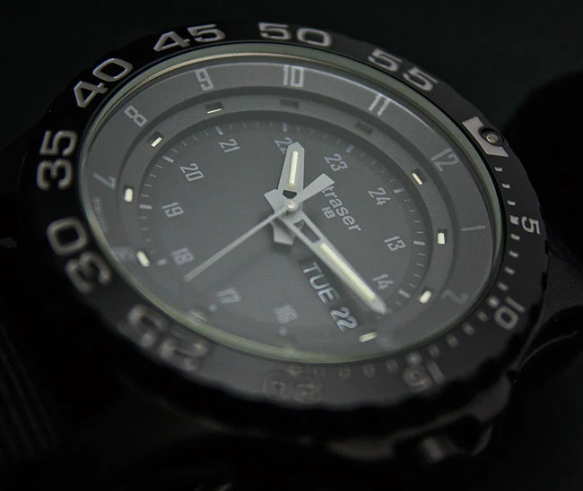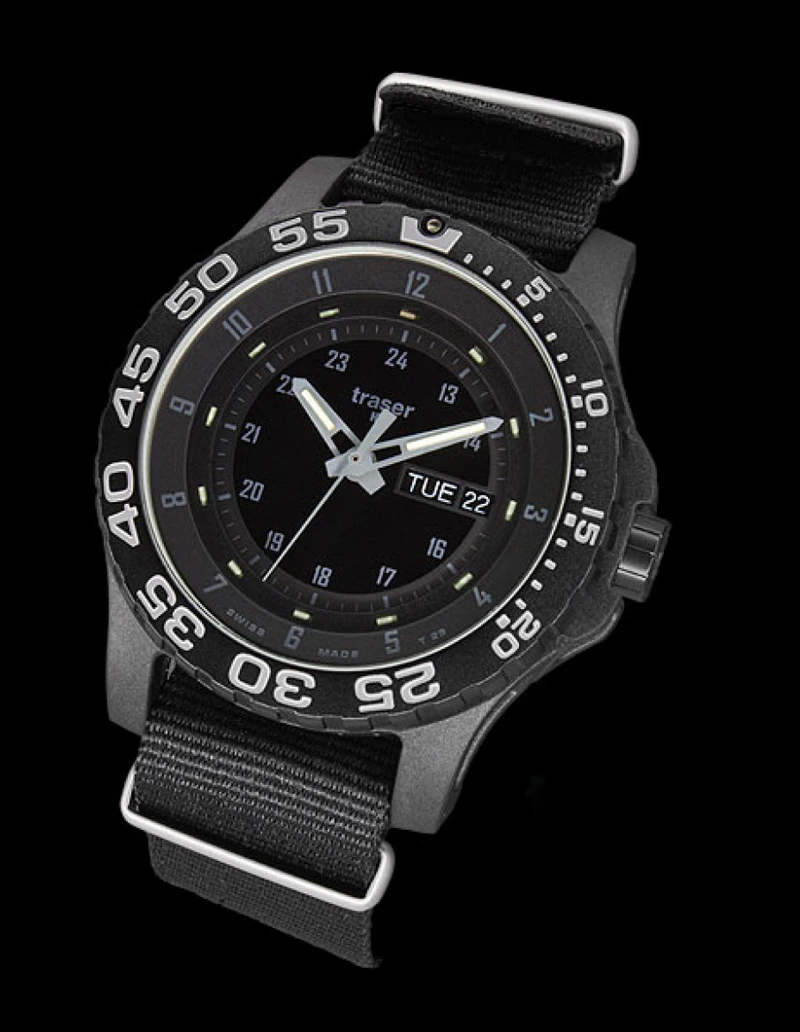 The P6600 Shade is the follow-up model of the P6600 Shadow. By request Traser H3 has equipped this model with a black PVD-plated trigalight® insert on the bezel and the quartz-movement Ronda 517.6 DD with day-date indication on a black calendar.