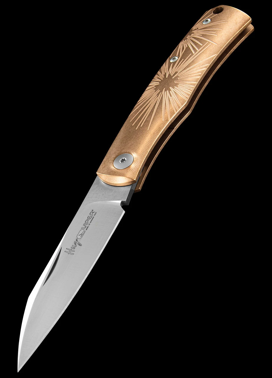 The Hug is a compact folding knife with a peaceful temperament, designed to go with its owner every day, always ready to offer extraordinary cutting qualities thanks to its ultra sharp Böhler M390 blade which is elegantly satin-finished. This is a very special limited edition with a bronze handle featuring a star design.