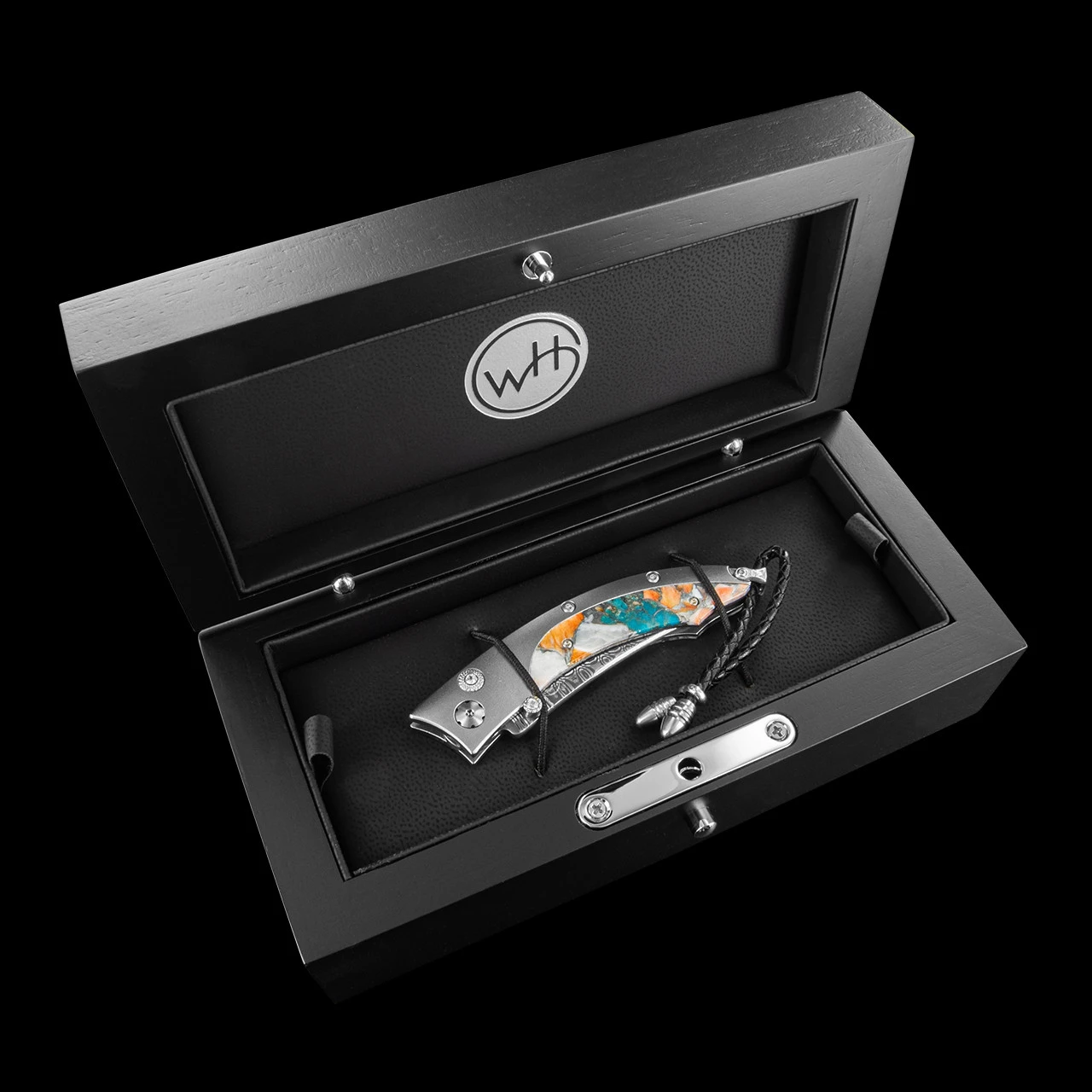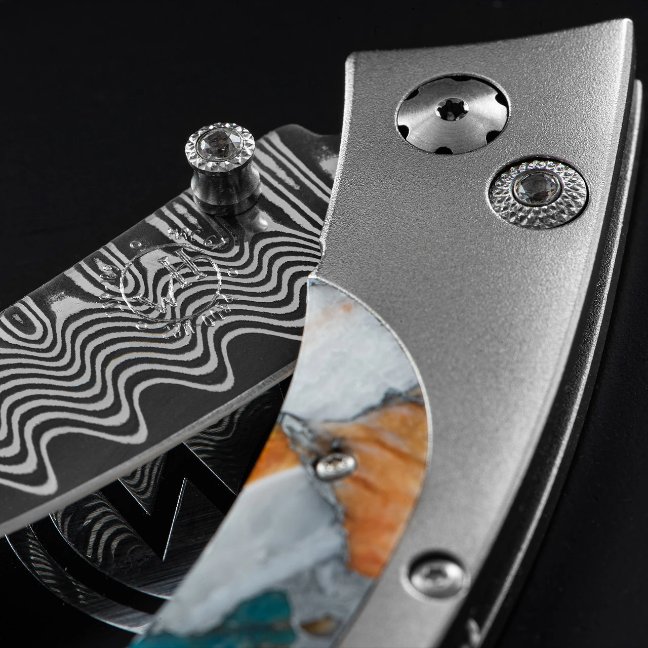 The William Henry Persian ‘Breeze’ features a light and resilient frame in aerospace grade titanium, inlaid with spiny oyster & turquoise. The blade is ‘Wave’ Damascus with an extra strong core of VG-10. The one-hand button lock and the thumb stud have been set with fine white topaz gemstones.