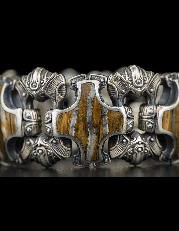 Sterling silver ‘shield’ bracelet, inlaid with a rare piece of fossil Woolly Mammoth tooth, one of the few remaining legacies of a creature that walked the earth at the dawn of civilization. Button lock clasp in stainless steel with inset diamond.